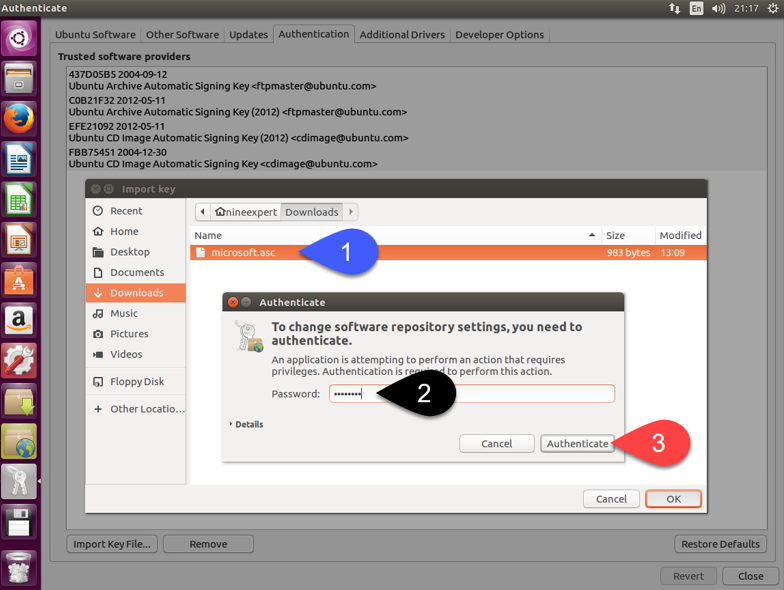 หากร้องขอให้พิสูจน์ตัวตนให้ใส่ Password ของผู้ใช้ที่สร้างขึ้นตอนติดตั้ง Ubuntu เพื่อพิสูจน์ตัวตน