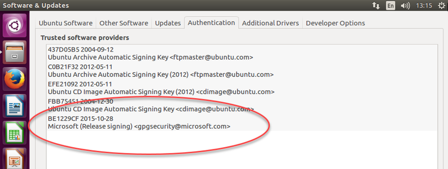 จะพบ GPG (GNU Privacy Guard) Public Key ของ Microsoft ปรากฏในรายการ Trusted Software Providers ดังแสดง