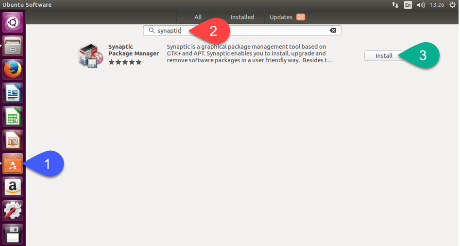 จากนั้นให้ค้นหา Software Package ชื่อว่า Synaptic แล้วเลือกติดตั้ง ดังแสดง