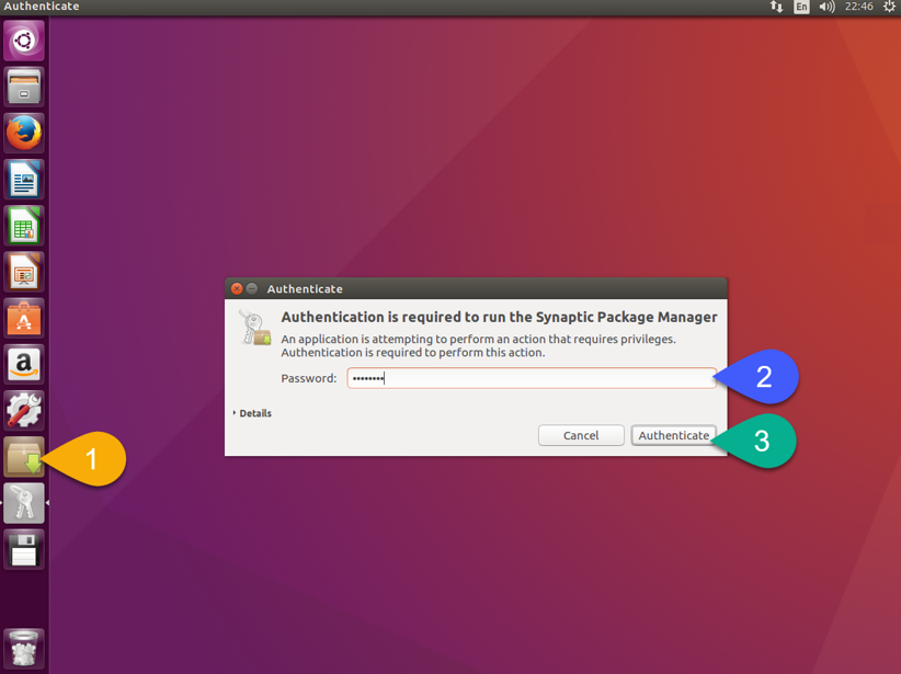 เรียกใช้ Synaptic Package Manager ทันทีหลังติดตั้งเสร็จ จะปรากฏหน้าต่าง Authenticate ขึ้น