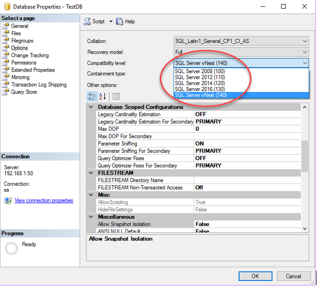 โดยผู้เขียนทดลองสร้างฐานข้อมูลชื่อ TestDB ขึ้นมา จากนั้นเรียกดู Properties ของฐานข้อมูล