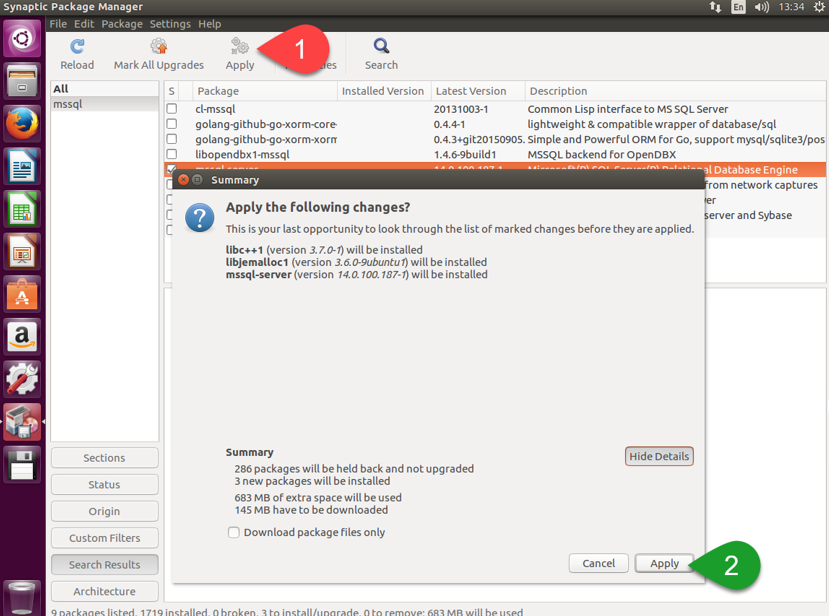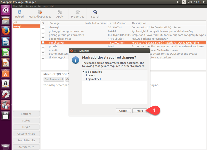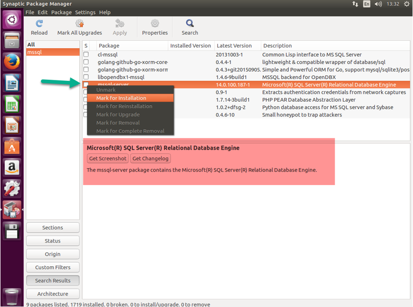 จะพบกับ Package ชื่อ mssql-server ดังแสดง ให้คลิกขวาแล้วเลือกไปที่ Mark for Installation เพื่อเลือกติดตั้ง