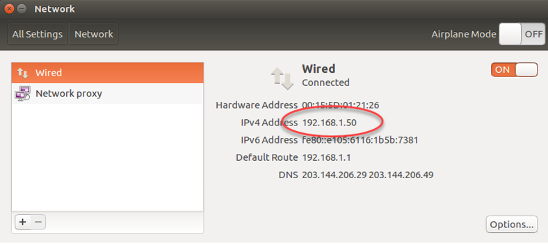 จะปรากฏหน้าต่าง Network ซึ่งมีรายละเอียดของ Interface ต่าง ๆ ดังแสดง จากรูปจะเห็นว่า IP Address ของสายสื่อสารคือ 192.168.1.50