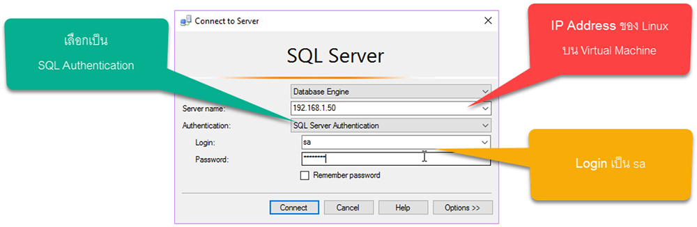 ส่วนการเชื่อมต่อกับเครื่อง Host นั้นผู้เขียนจะติดตั้ง Microsoft SQL Server Management Studio (SSMS) ไว้ในเครื่อง Host