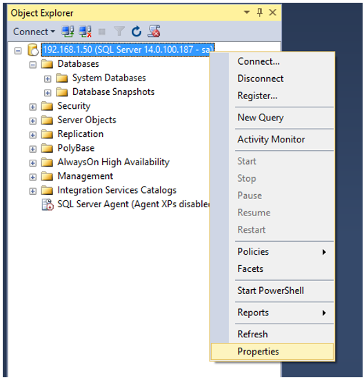 ผู้เขียนเรียกดูรายละเอียดของเซิร์ฟเวอร์โดยคลิกขวาที่ชื่อ Instance แล้วเลือก ไปที่ Properties ดังแสดง