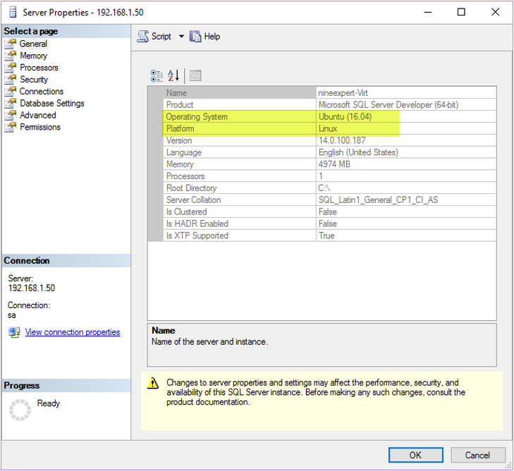 จะปรากฏหน้าต่าง Server Properties และพบว่า Microsoft SQL Server ติดตั้งอยู่บนระบบปฏิบัติการ Linux ดังแสดง