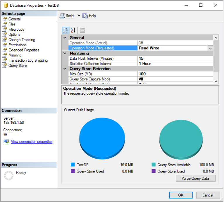 พบว่ามีส่วนที่สามารถตั้งค่าเกี่ยวกับ Query Store ได้ ผู้เขียนจึงทดลองกำหนดค่าดังแสดง
