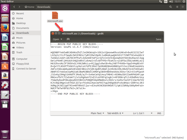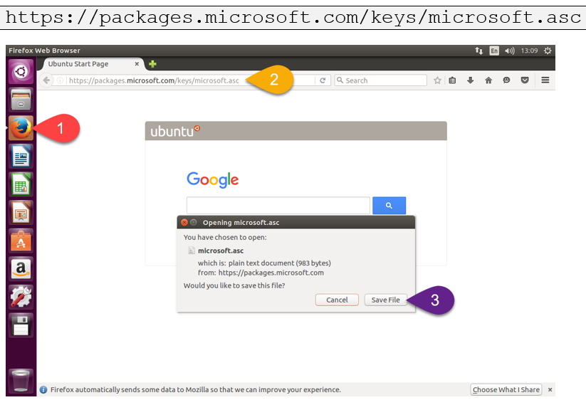 เมื่อเข้าสู่ Desktop ของ Ubuntu ให้ใช้ Mozilla Firefox ช่วยดาวน์โหลด GPG (GNU Privacy Guard) Public Key จาก Microsoft โดยป้อนลิงก์ต่อไปนี้ลงไป ดังแสดง