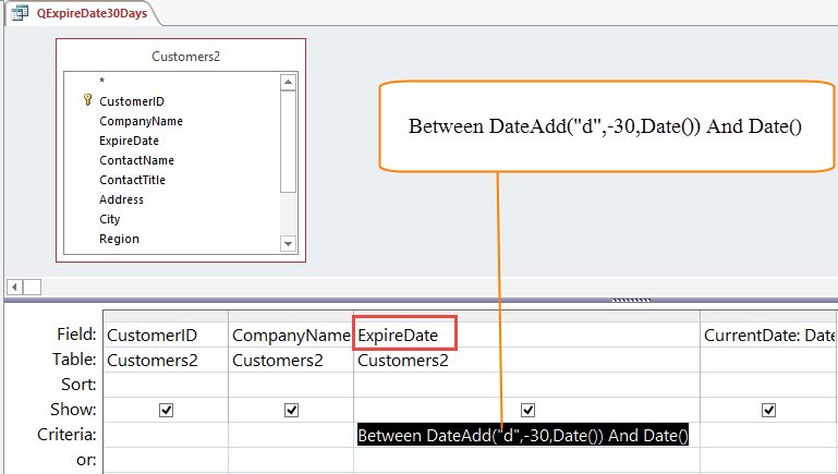 | Customer ID | Company Name | ExpireDate | CurrentDate |