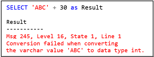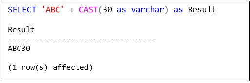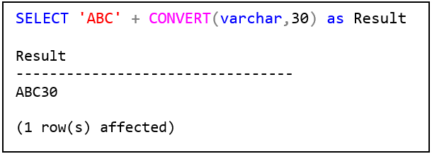 จากตัวอย่างที่สองหากต้องการให้ได้ผลลัพธ์เป็น 'ABC30' จะต้องแปลงข้อมูลชนิดตัวเลขไปเป็นตัวอักษรด้วย Explicit Conversion ดังแสดง