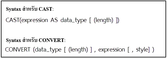 แต่สำหรับฟังก์ชัน Convert มีใช้ใน Microsoft SQL Server เท่านั้น โดย Syntax ของฟังก์ชันทั้งสองเป็นดังนี้