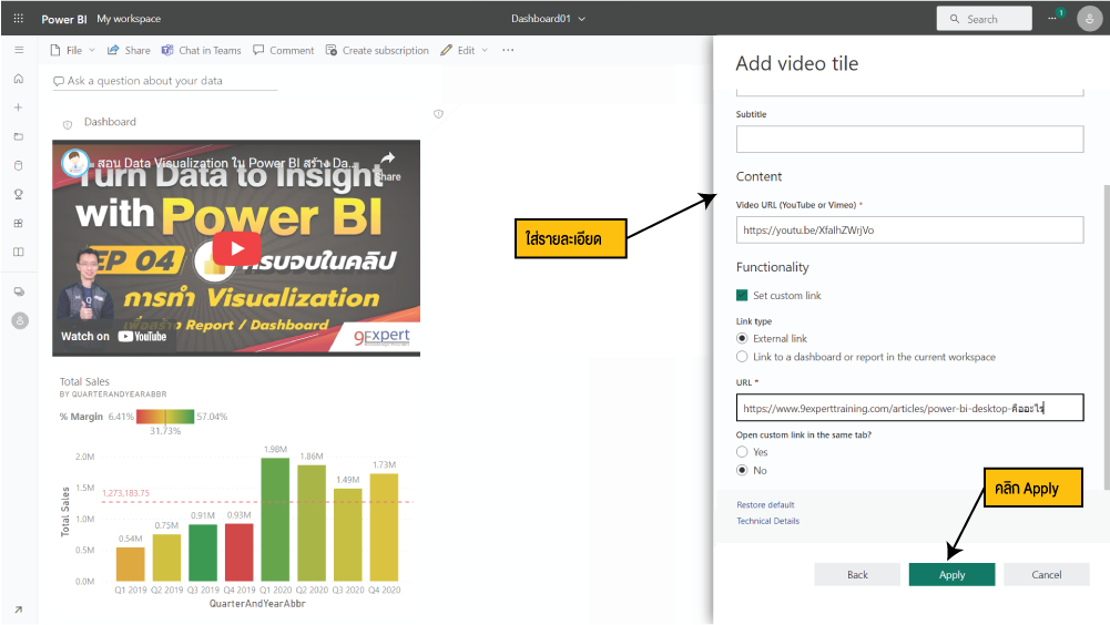 โดยระบุ Video URL พร้อมกำหนด ลิงค์ว่าหากคลิกลิงค์จาก Video จะให้ไปที่ URL https://www.9experttraining.com/articles/power-bi-desktop-คืออะไร