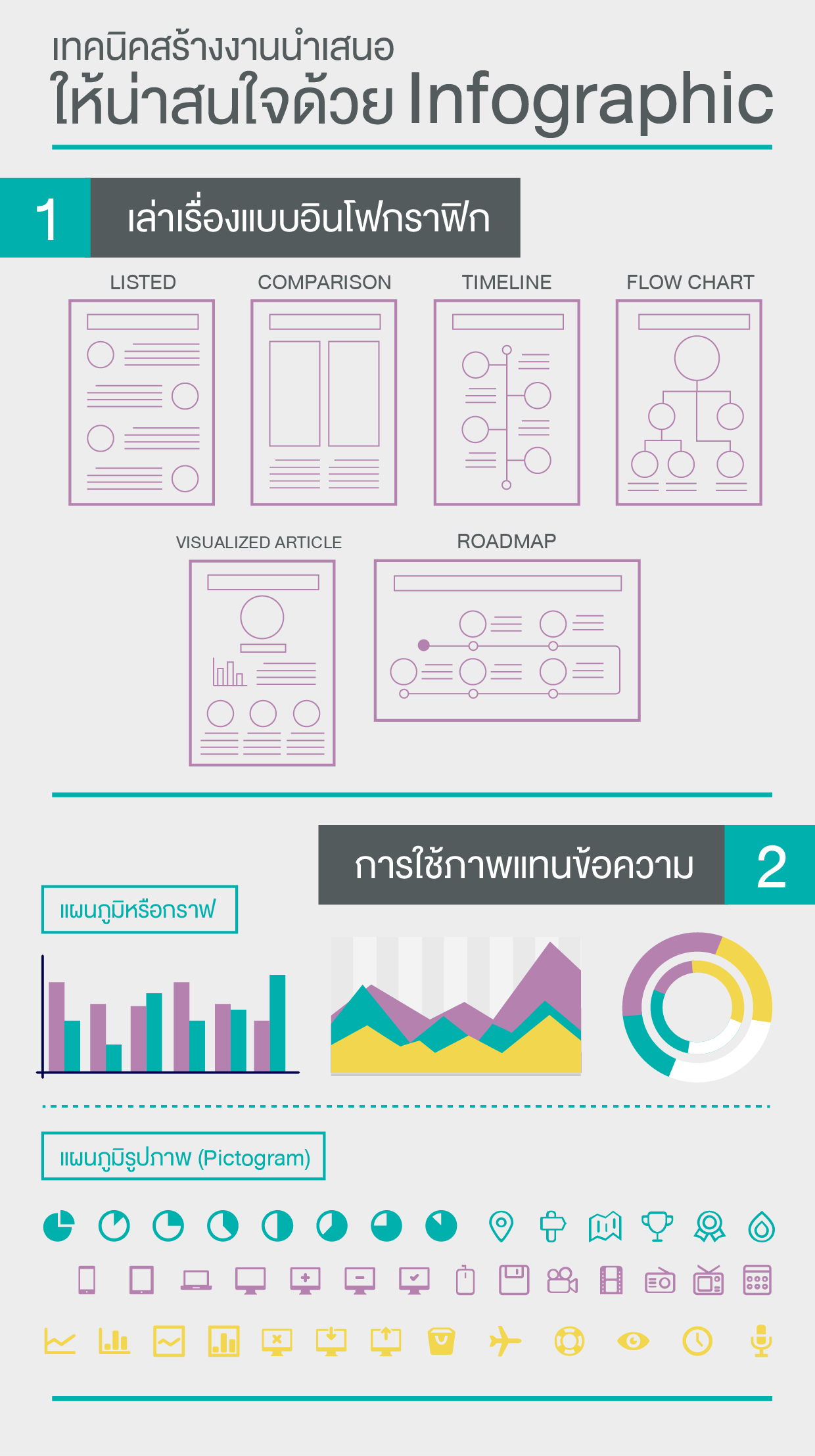 การใช้ภาพแทนข้อความซึ่งการใช้ภาพแทนข้อความเป็นส่วนสำคัญมากในงานแบบ Infographic